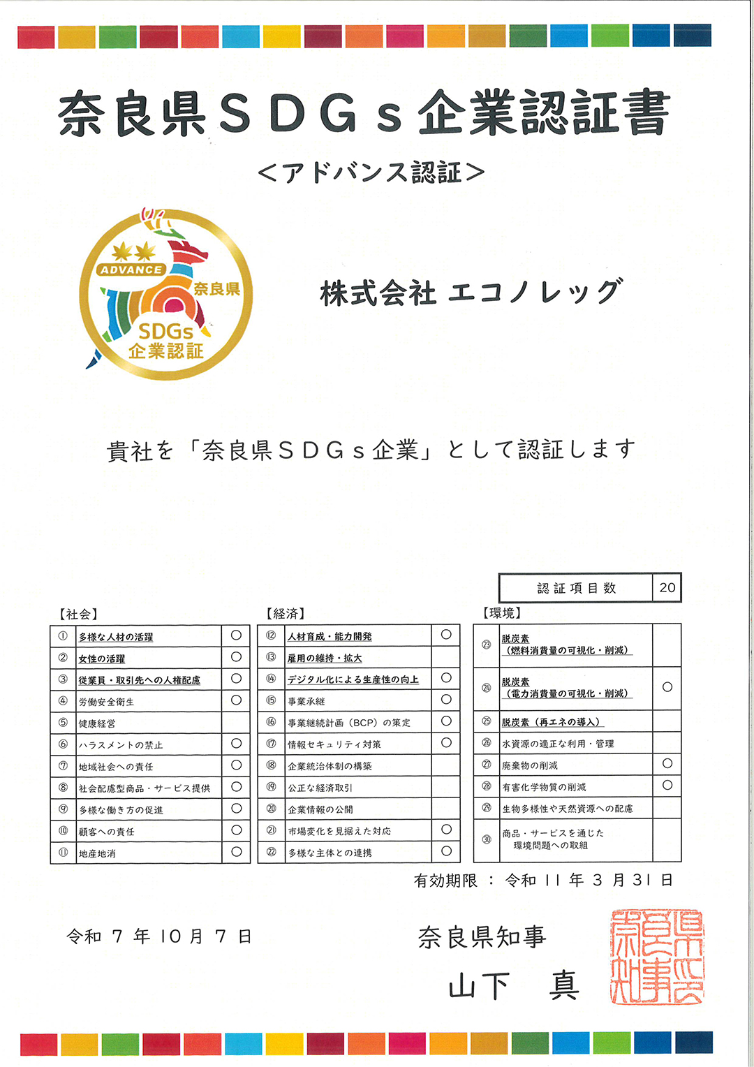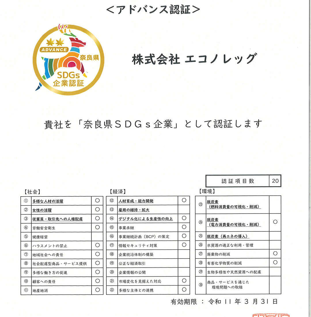 エコノレッグは審査を通り認証基準が20項目を超えましたので「アドバンス認証」を受けました。