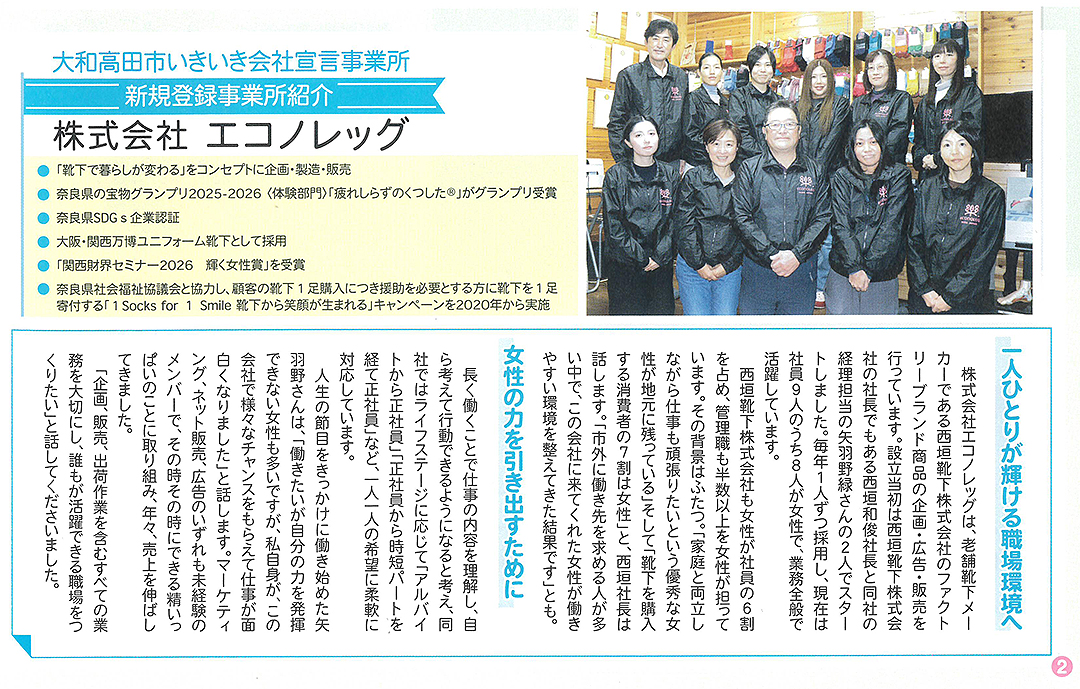 大和高田市いきいき会社宣言事業所に「株式会社エコノレッグ」が令和7年度に登録されました。